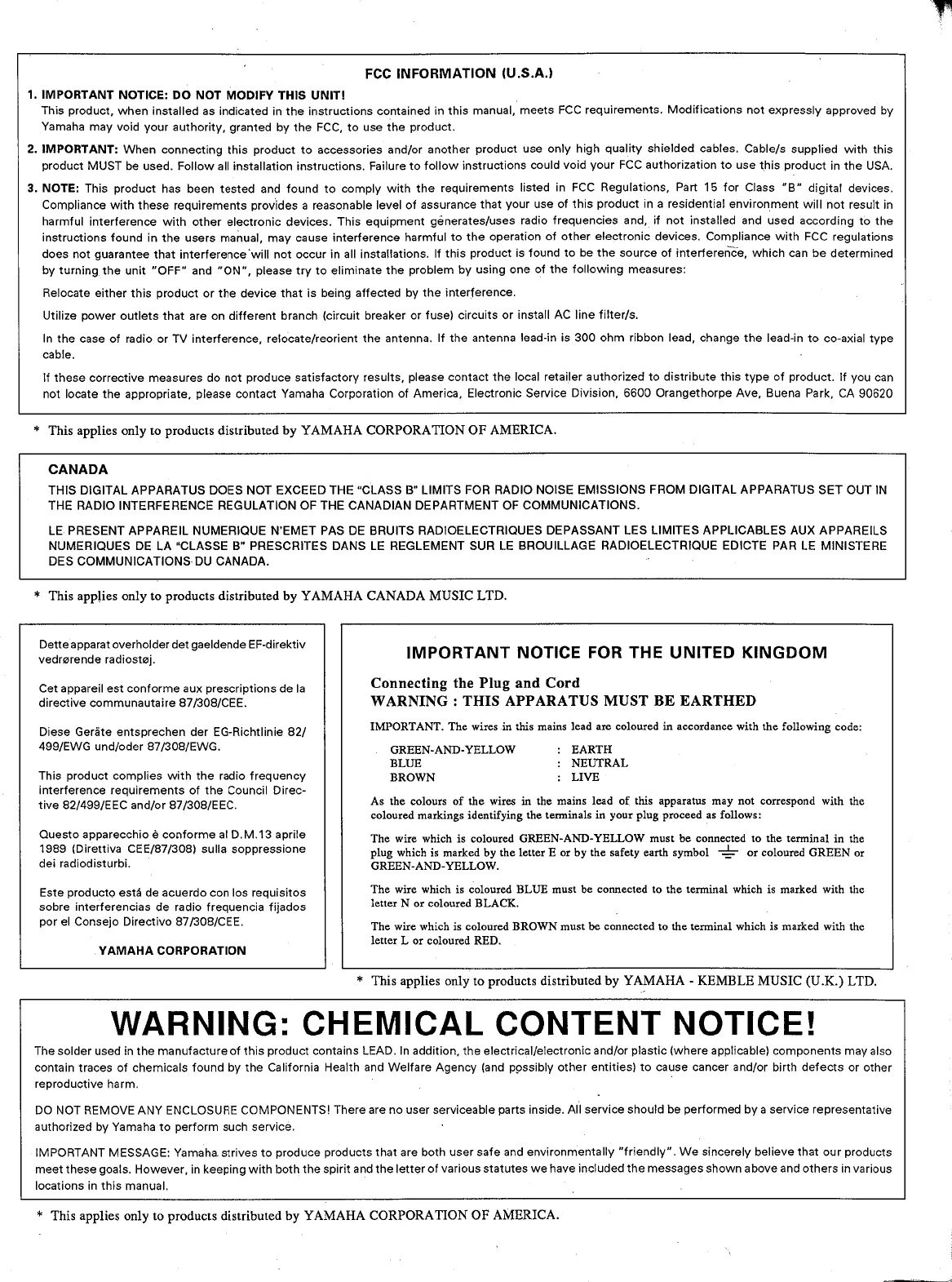 Yamaha EMP700 - Important Safety and Compliance Notices; FCC Compliance Statement (USA); FCC Compliance Statement (Canada); UK Mains Lead and Earthing Warning