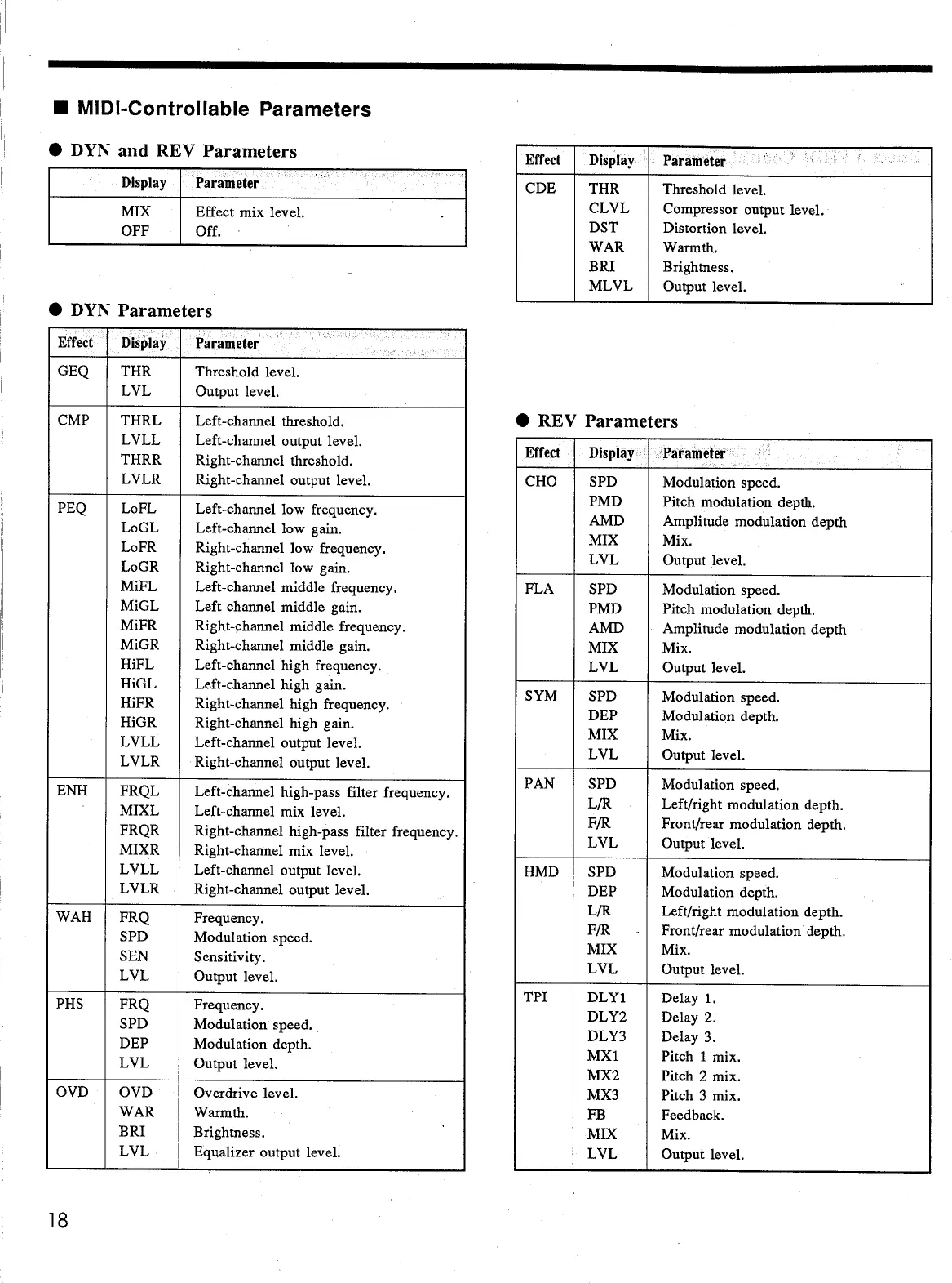 Yamaha EMP700 - MIDI-Controllable Parameters; DYN and REV Parameters; DYN Parameters; REV Parematers