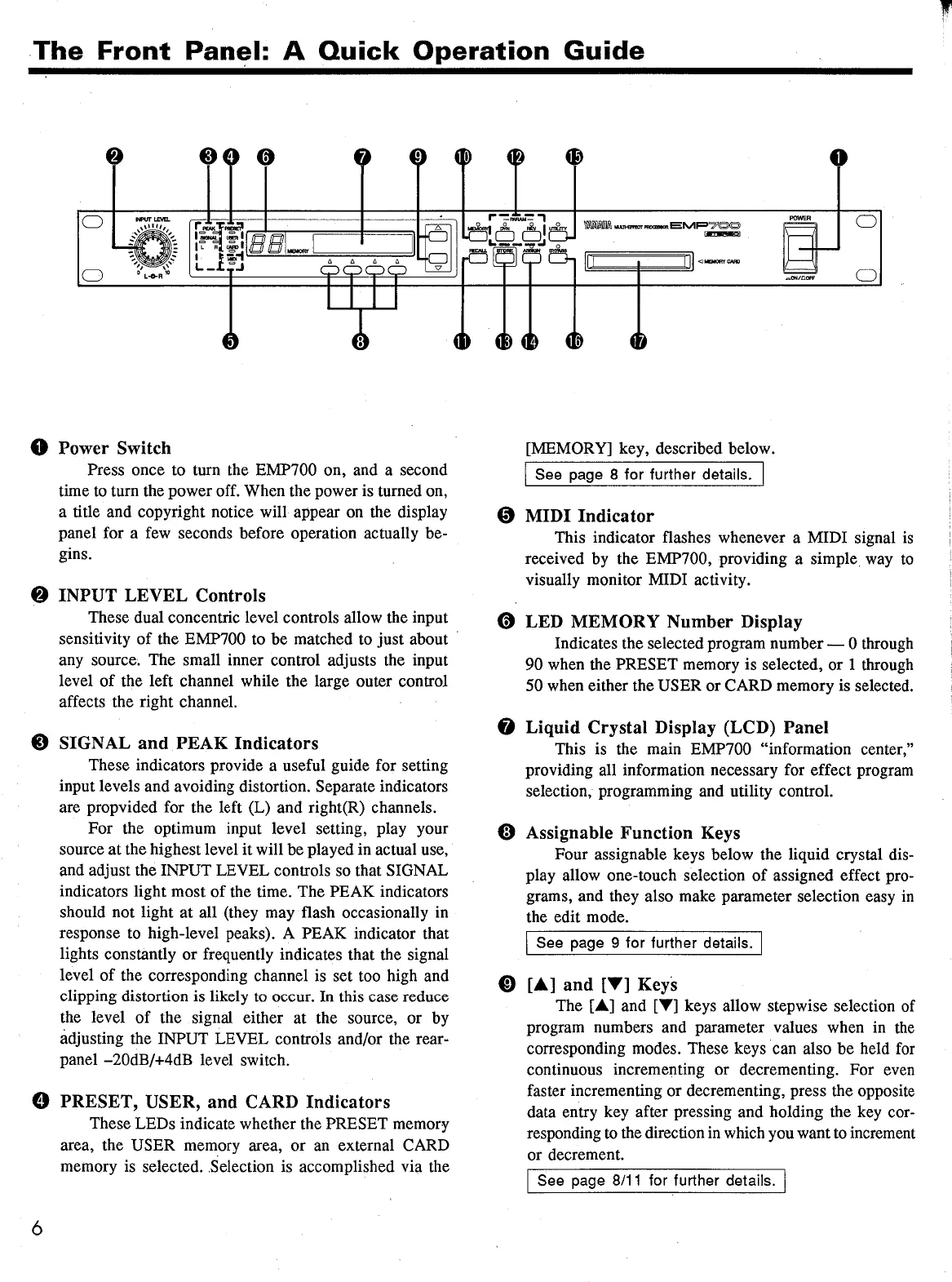Yamaha EMP700 - Front Panel Layout and Controls; Power Switch Operation; Input Level Controls; Signal and Peak Indicators