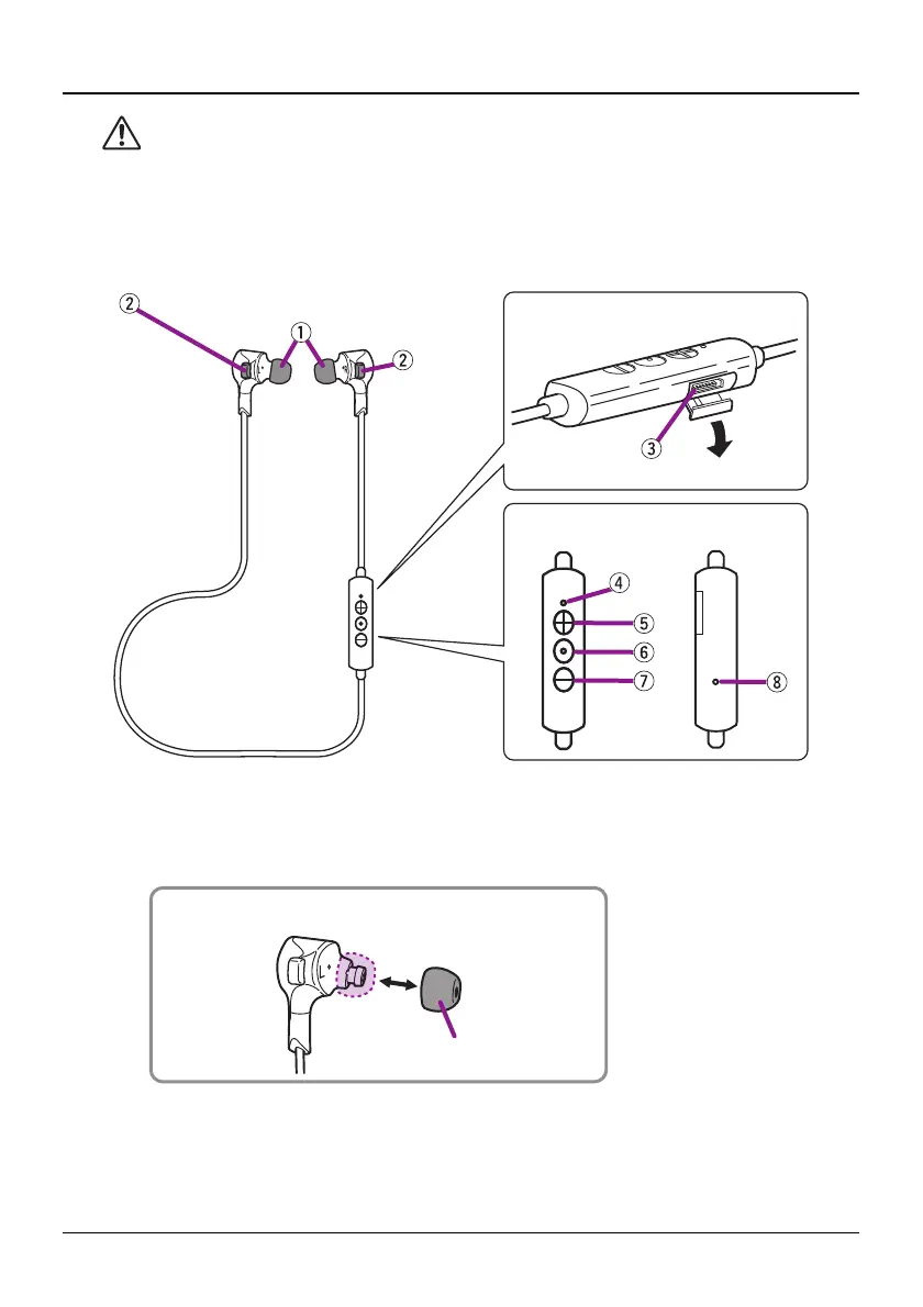 • Gebruik de oortelefoon niet met losgeraakte of kapotte oordopjes of oorstabilisatoren.