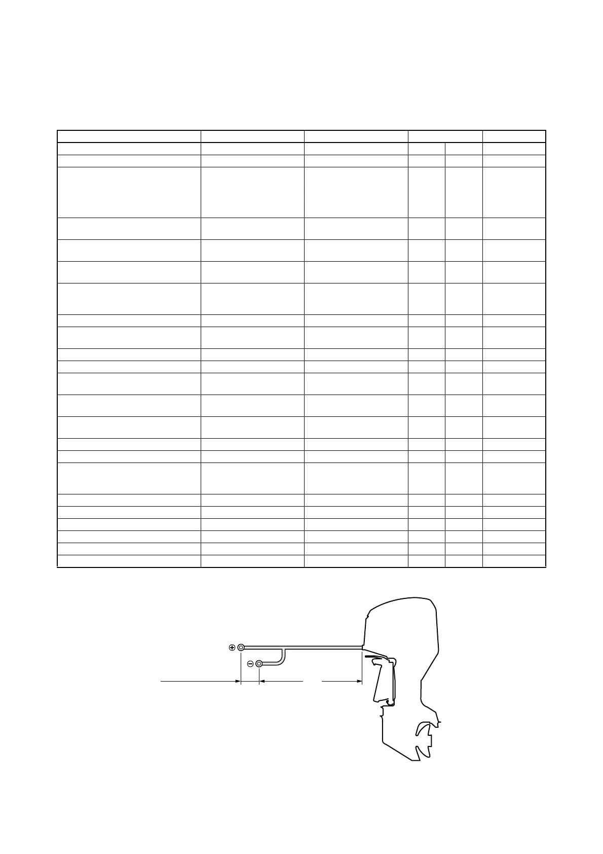 The following table shows the battery cable length to the (–) terminal from the grommet of outboard