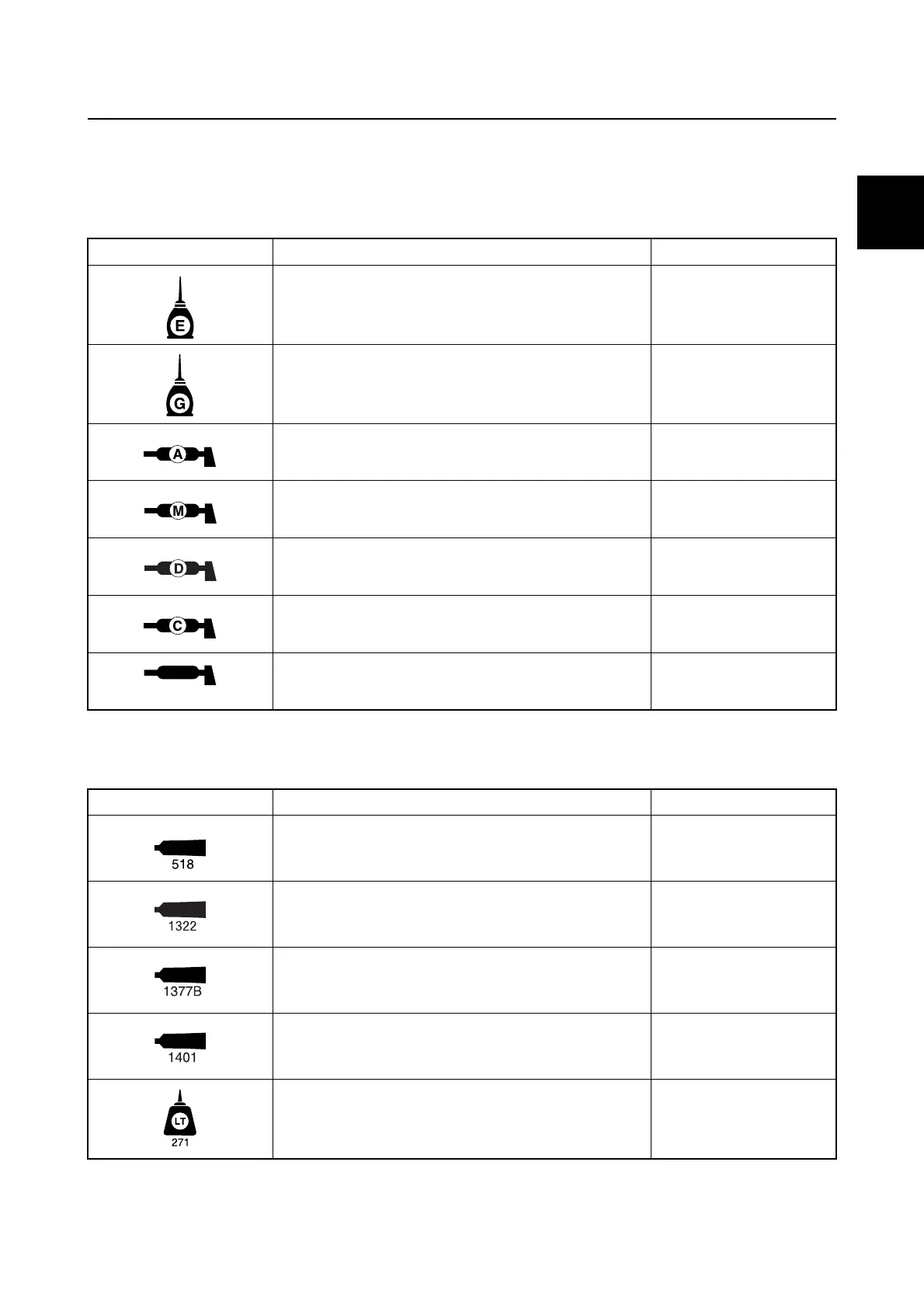 Symbols in an exploded diagram or illustration indicate the type of sealant or thread locking agent