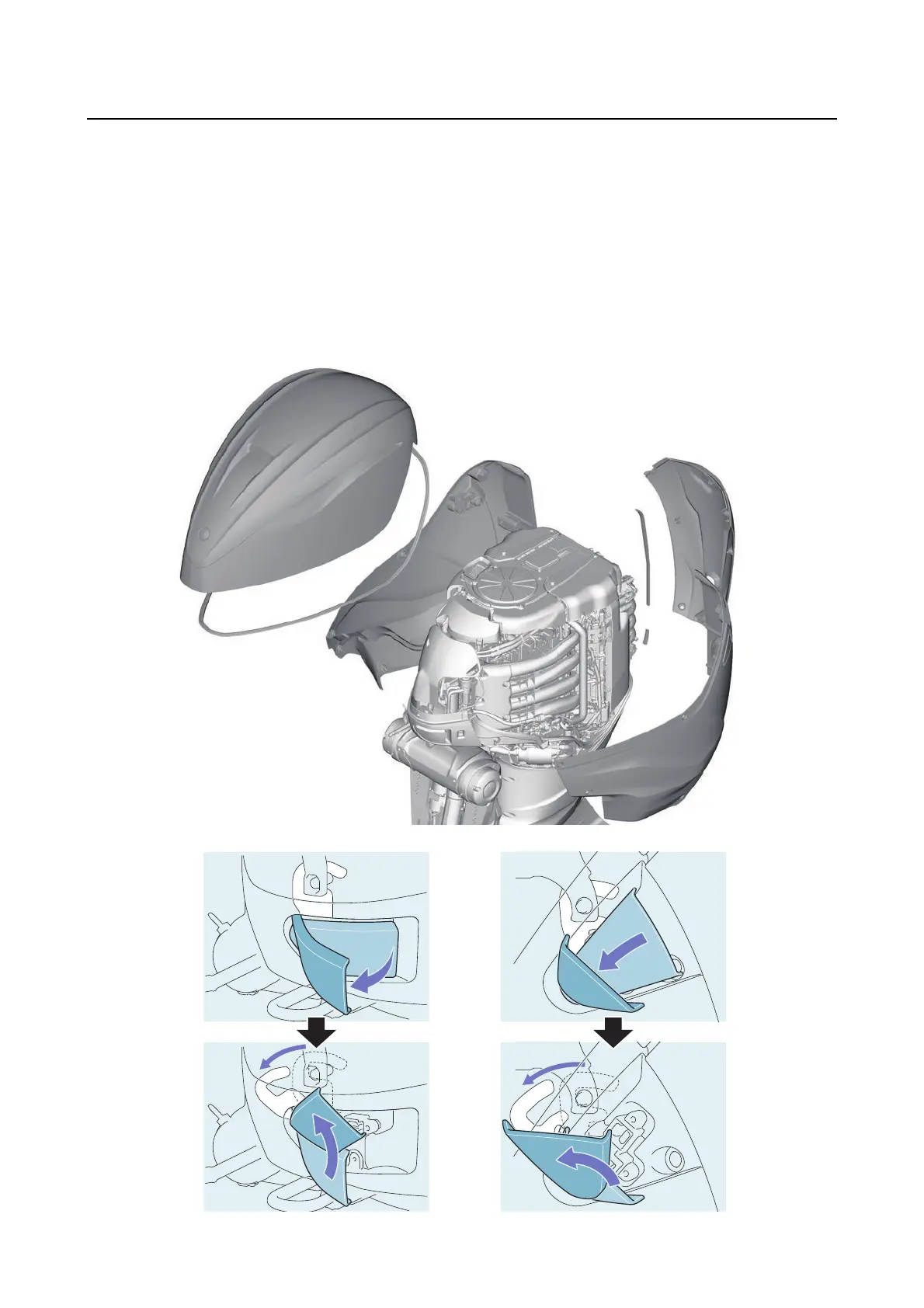 The bottom cowling cover and bottom cowlings can also be removed and installed while the boat is