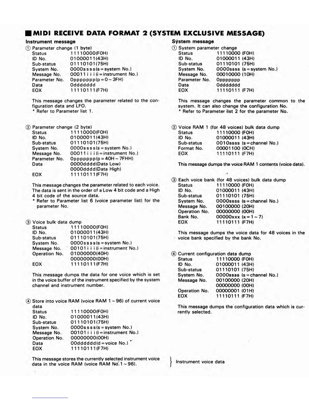 Yamaha FB-01 - MIDI Receive Data Format 2; SysEx Parameter Change Formats; Voice Data Dump Formats