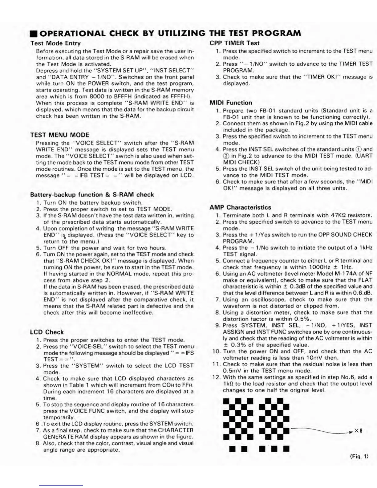 Yamaha FB-01 - Operational Checks and Test Programs; Test Mode Entry & Navigation; S-RAM & Battery Backup Verification; MIDI & Amplifier Performance Tests
