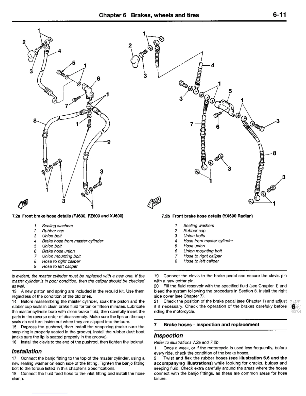 Yamaha FJ - Front Brake Hose Details; Rear Brake Master Cylinder Installation; Brake Hoses Inspection