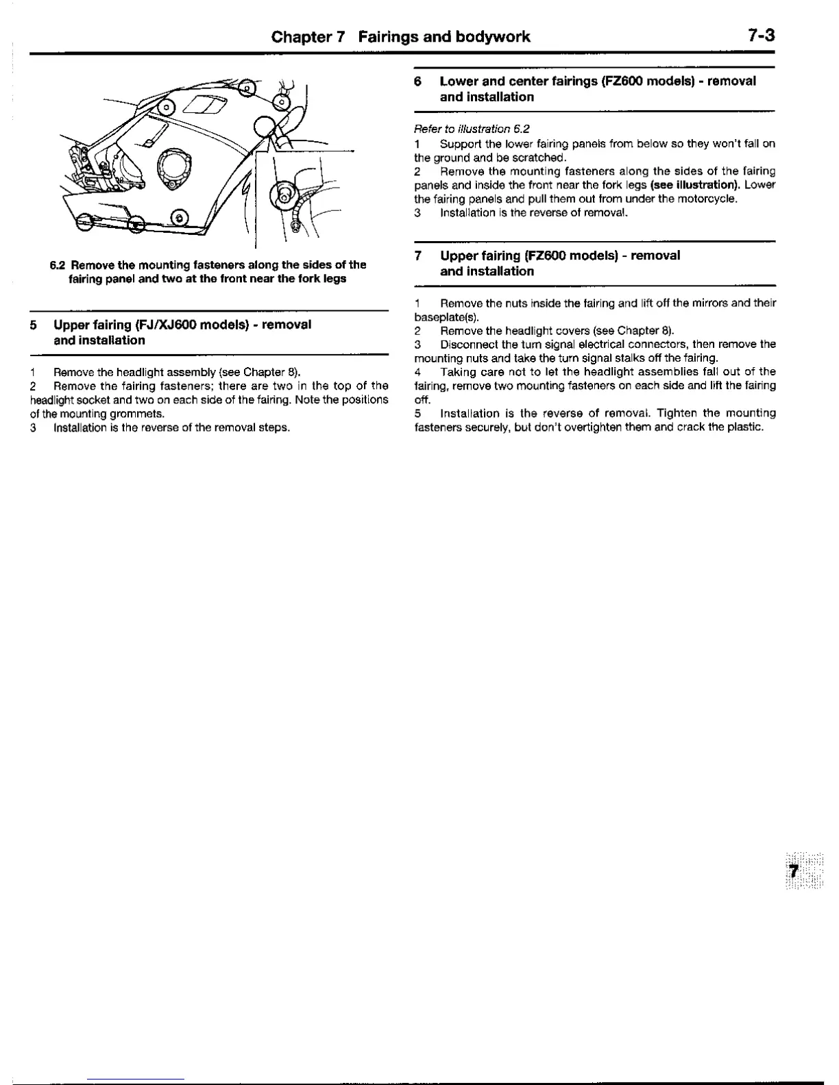 Yamaha FJ - Upper Fairing Removal and Installation; Lower and Center Fairings Removal and Installation