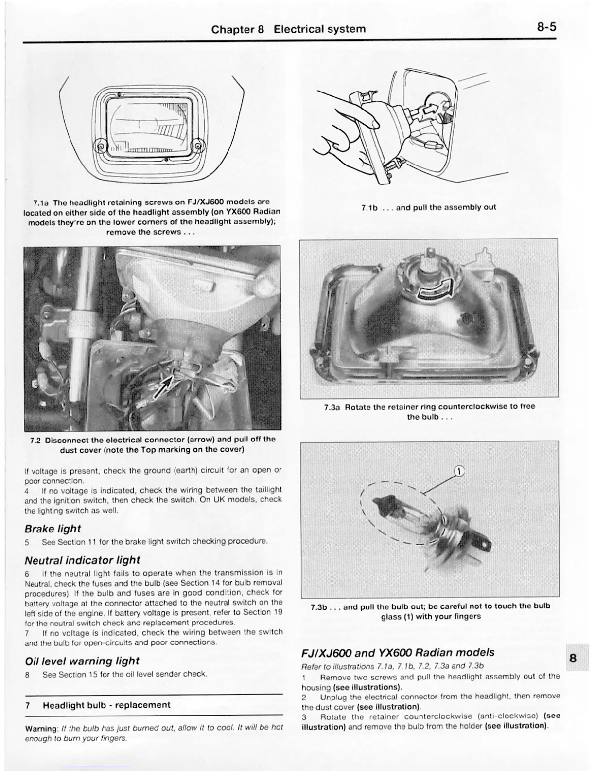 Yamaha FJ - Headlight Bulb - Replacement; Brake Light; Neutral Indicator Light; Oil Level Warning Light