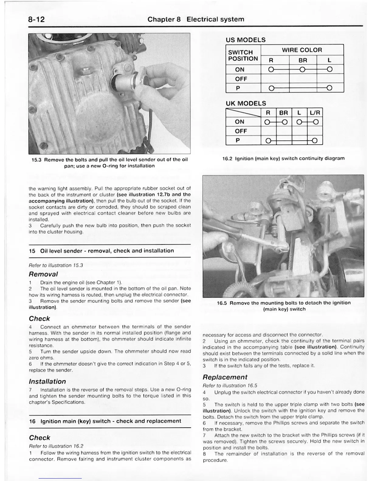 Yamaha FJ - Oil Level Sender Removal; Oil Level Sender Check; Oil Level Sender Installation; Ignition Main (Key) Switch Check and Replacement