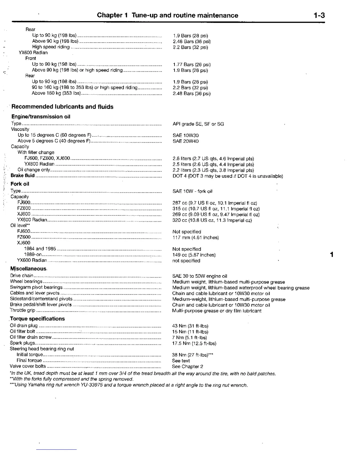 Yamaha FJ - Recommended Lubricants and Fluids