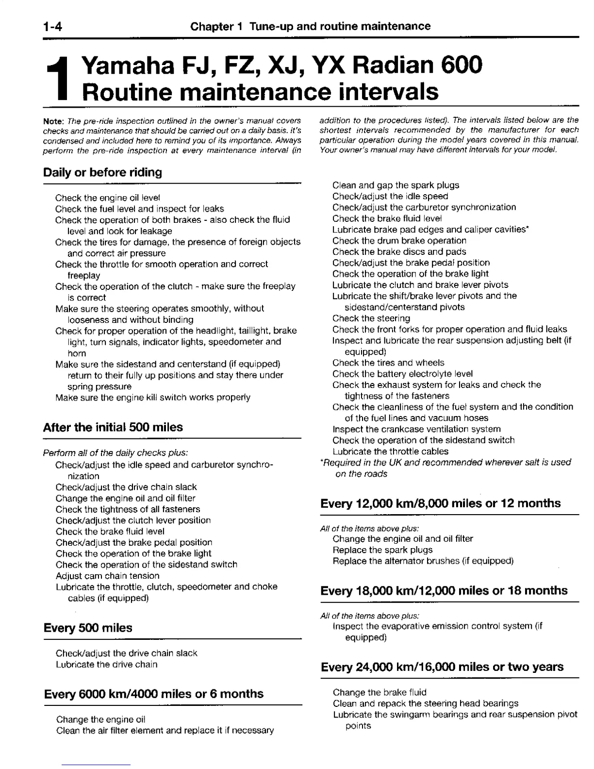 Yamaha FJ - Yamaha FJ, FZ, XJ, YX Radian 600 Routine Maintenance Intervals; Daily or before Riding; After the Initial 500 Miles; Every 500 Miles