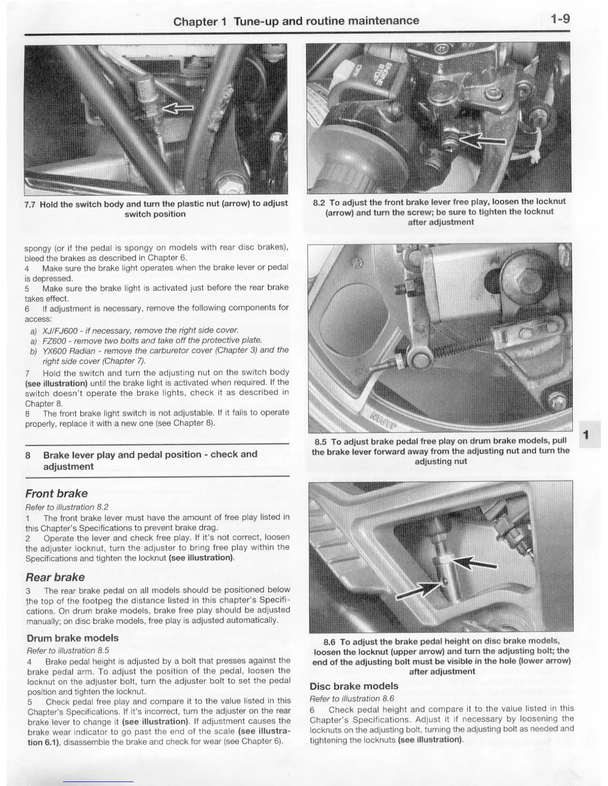 Yamaha FJ - Brake Lever Play and Pedal Position - Check and Adjustment; Front Brake; Rear Brake; Drum Brake Models