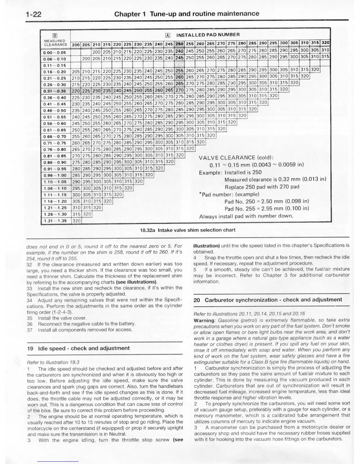 Yamaha FJ - Idle Speed - Check and Adjustment; Carburetor Synchronization - Check and Adjustment; Intake Valve Shim Selection Chart