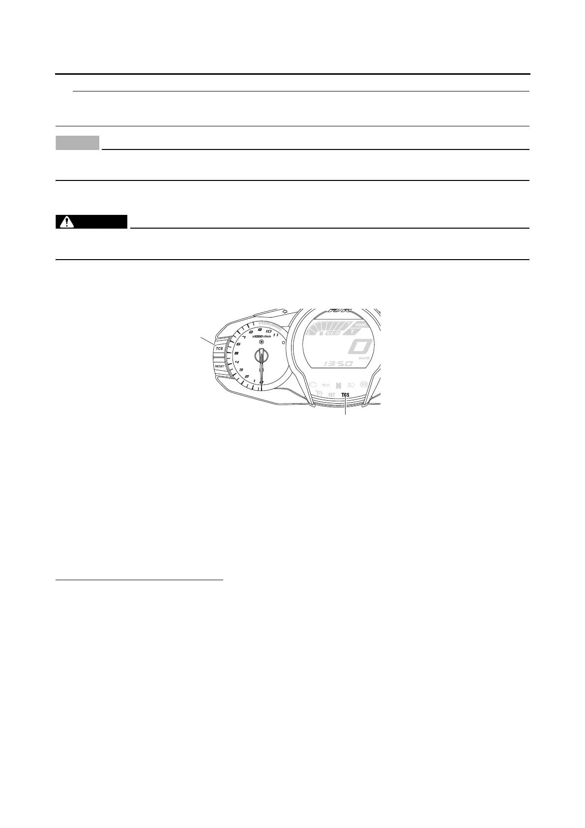To turn off the traction control system, push the “TCS” button on the meter assembly for at least 2 sec-