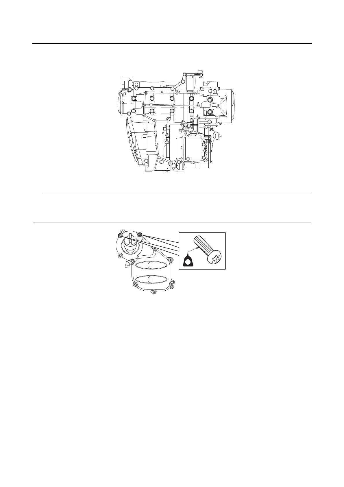 Apply locking agent (LOCTITE®) only to the threads of the 2 upper middle gear case cover bolts, and