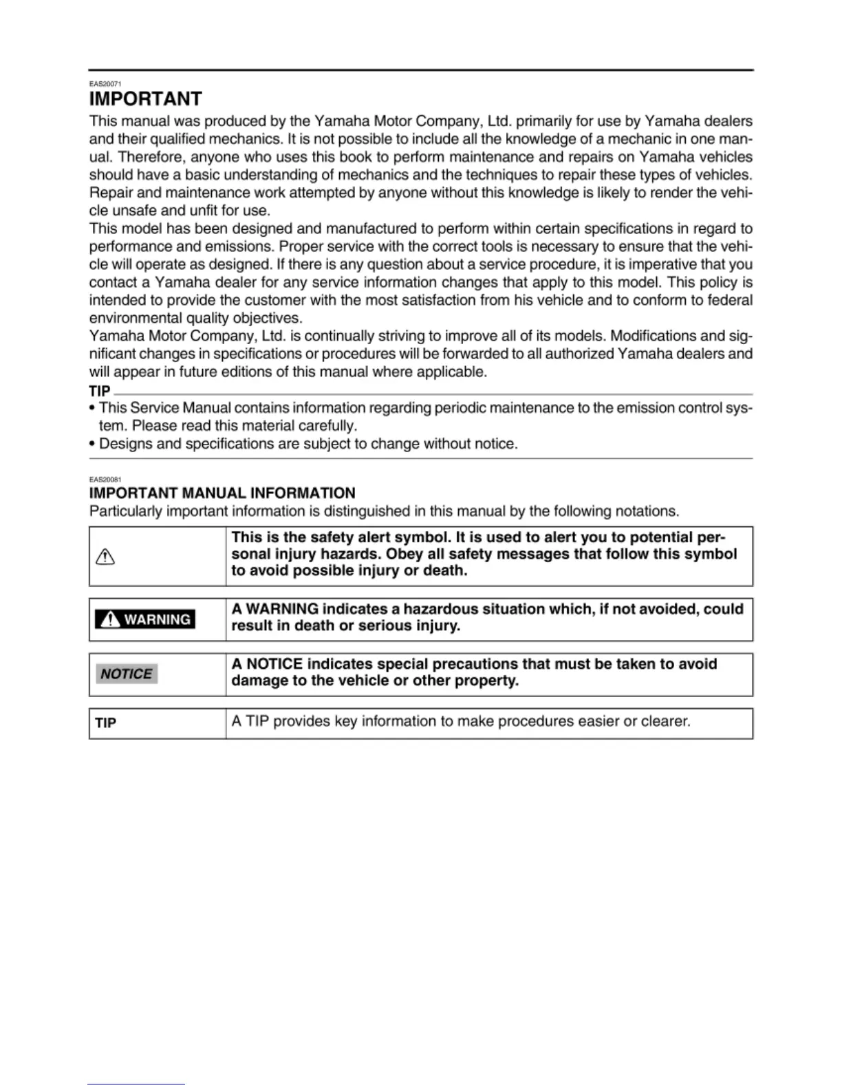 This manual was produced by the Yamaha Motor Company, Ltd. primarily for use by Yamaha deale