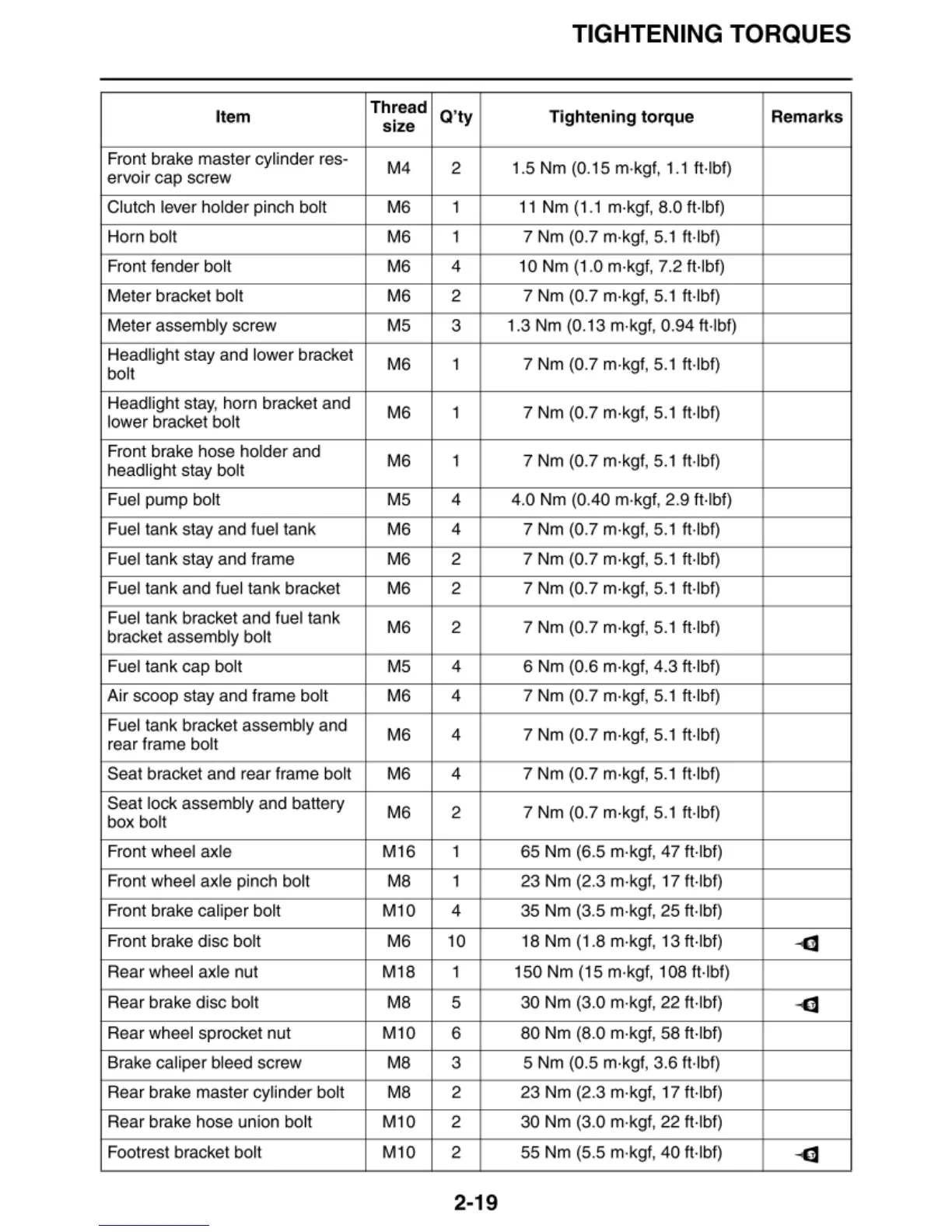 Seat bracket and rear frame bolt M6 4 7 Nm (0.7 m·kgf,
