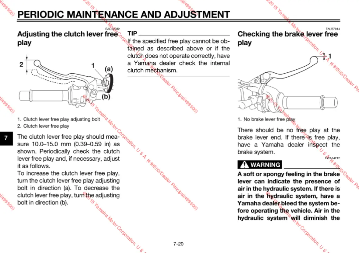 Yamaha FZ09F - Adjusting the clutch lever free play; Checking the brake lever free play
