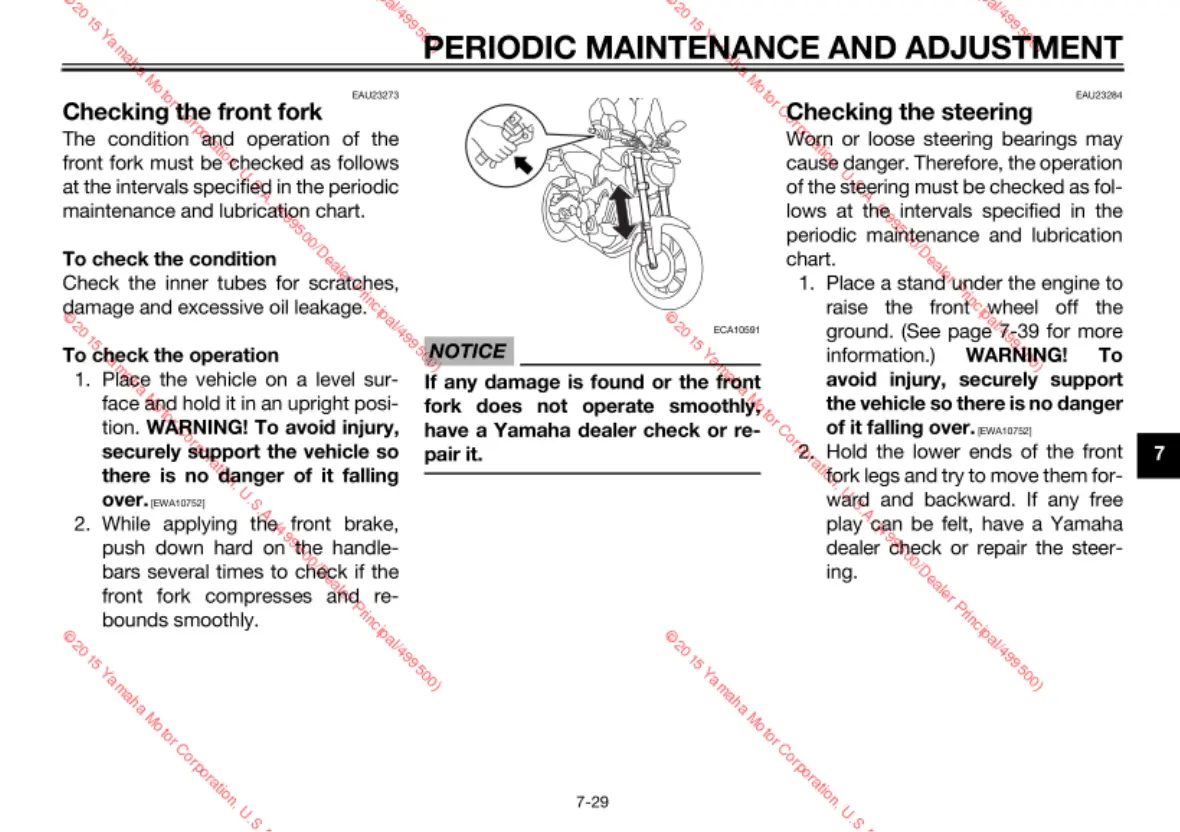 Yamaha FZ09F - Checking the front fork; Checking the steering