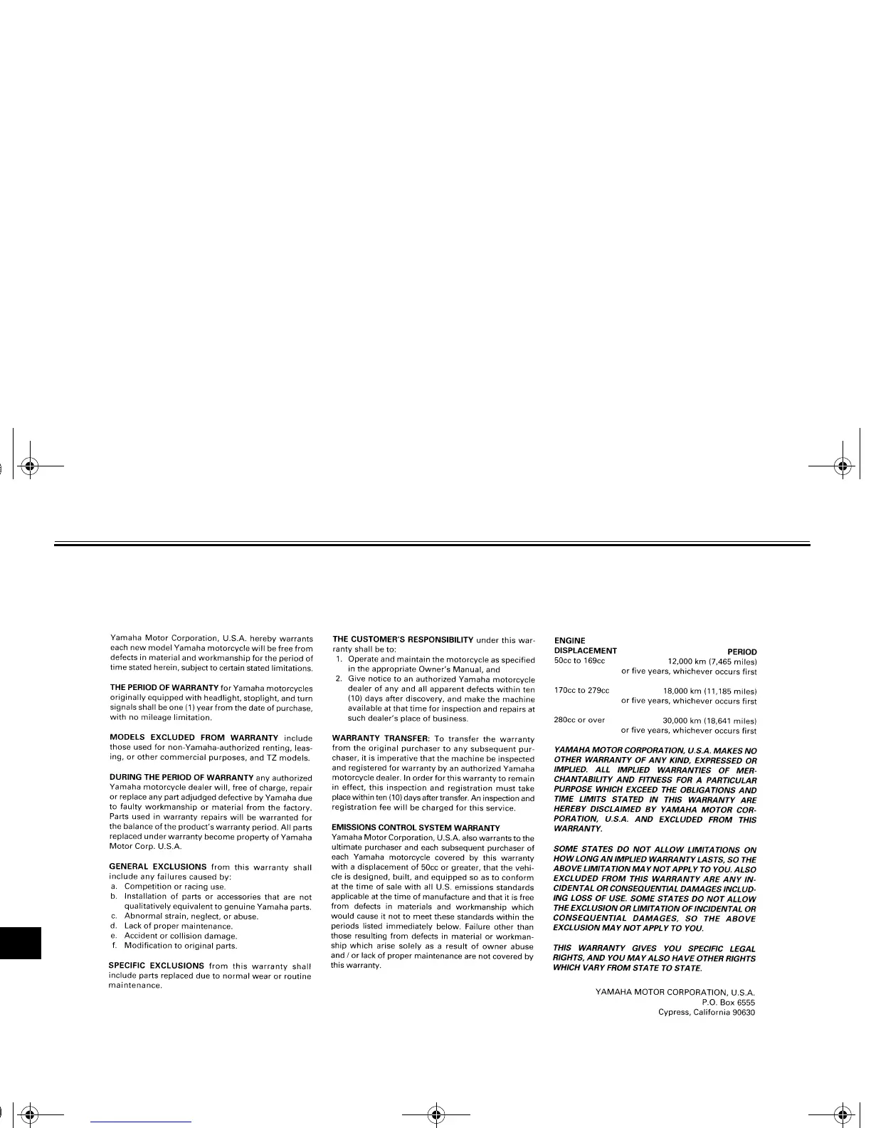 Yamaha FZ1 - Yamaha Motor Corporation, U.s.a. Street and Enduro Motorcycle Limited Warranty