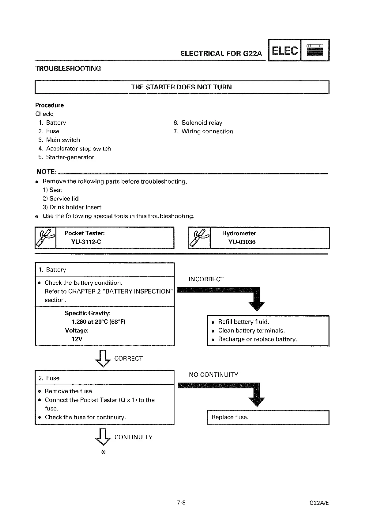Yamaha G22 A/E - Troubleshooting; The Starter Does Not Turn