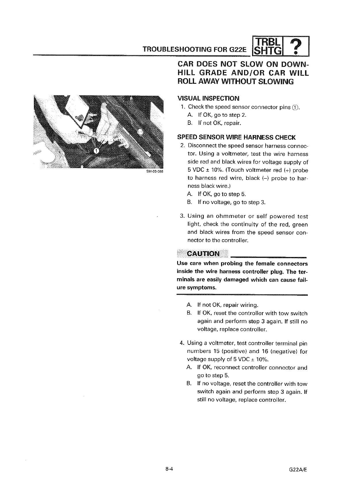 Yamaha G22 A/E - Car Does Not Slow on Downhill Grade And;Or Car will Roll Away Without Slowing; Speed Sensor Wire Harness Check