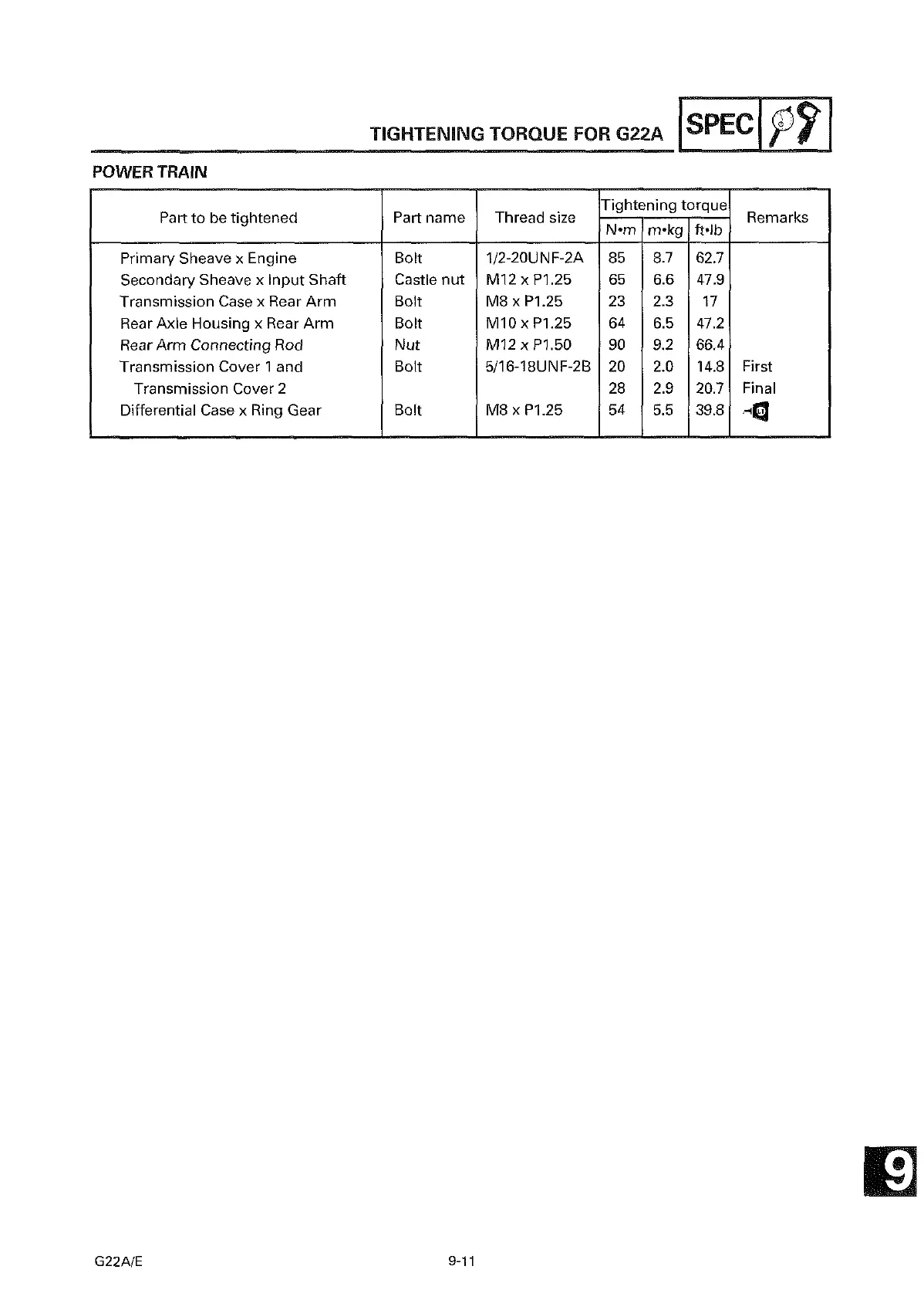 Yamaha G22 A/E - Power Train Specifications