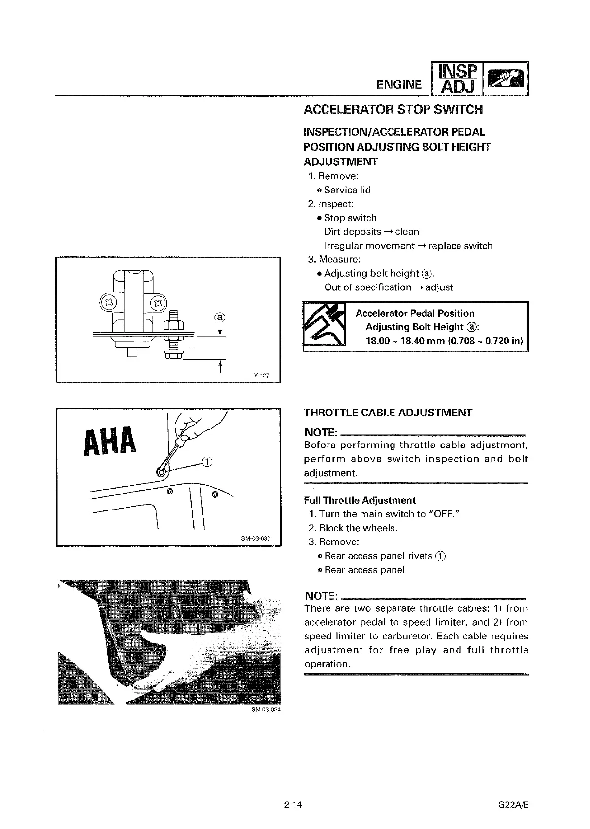 Yamaha G22 A/E - Accelerator Stop Switch; Inspection;Accelerator Pedal Position Adjusting Bolt Height Adjustment; Throttle Cable Adjustment