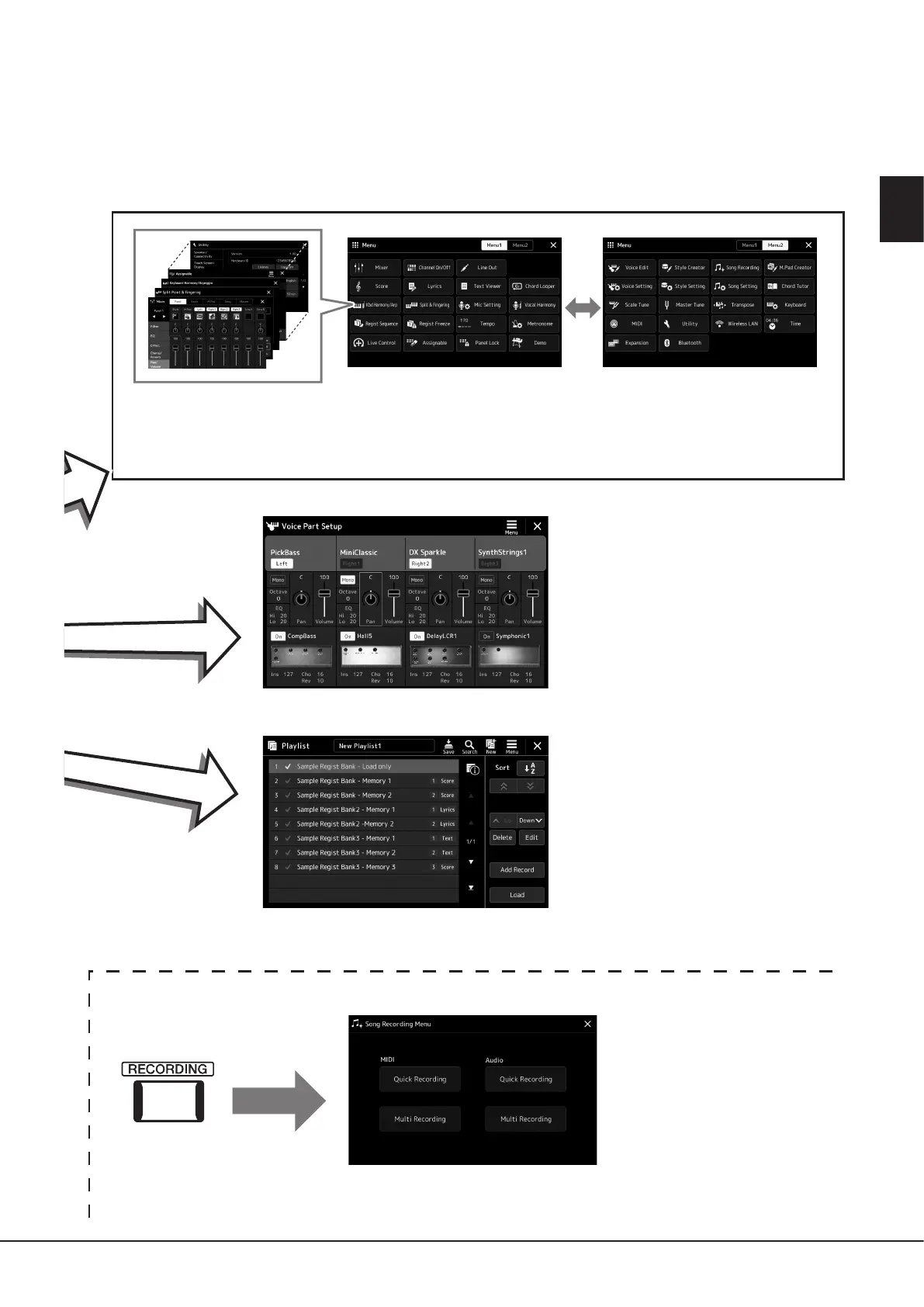 By touching each of the icons, you can call up various functions, such as Song Score, Volume Balance and other