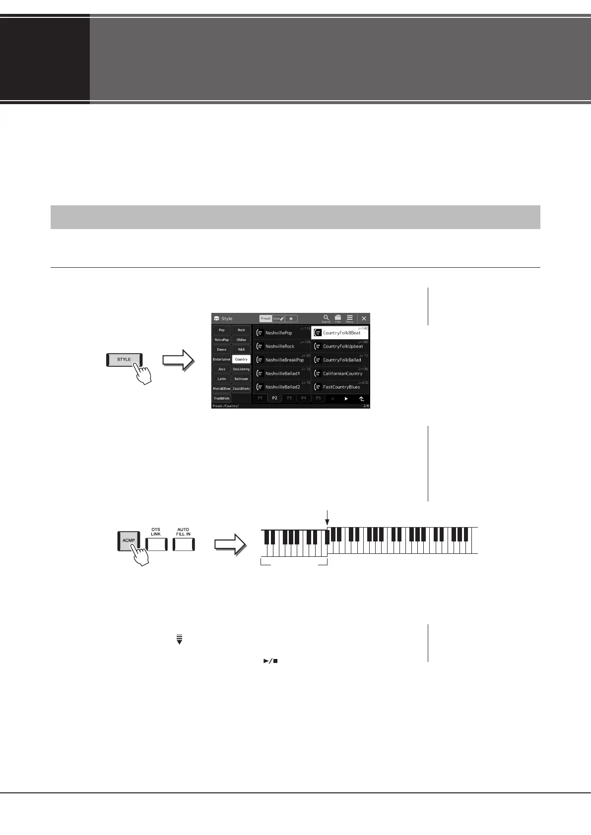 This section gives you basic steps on how to enhance your keyboard performance with Styles (Rhythm and Auto Accompaniment).
