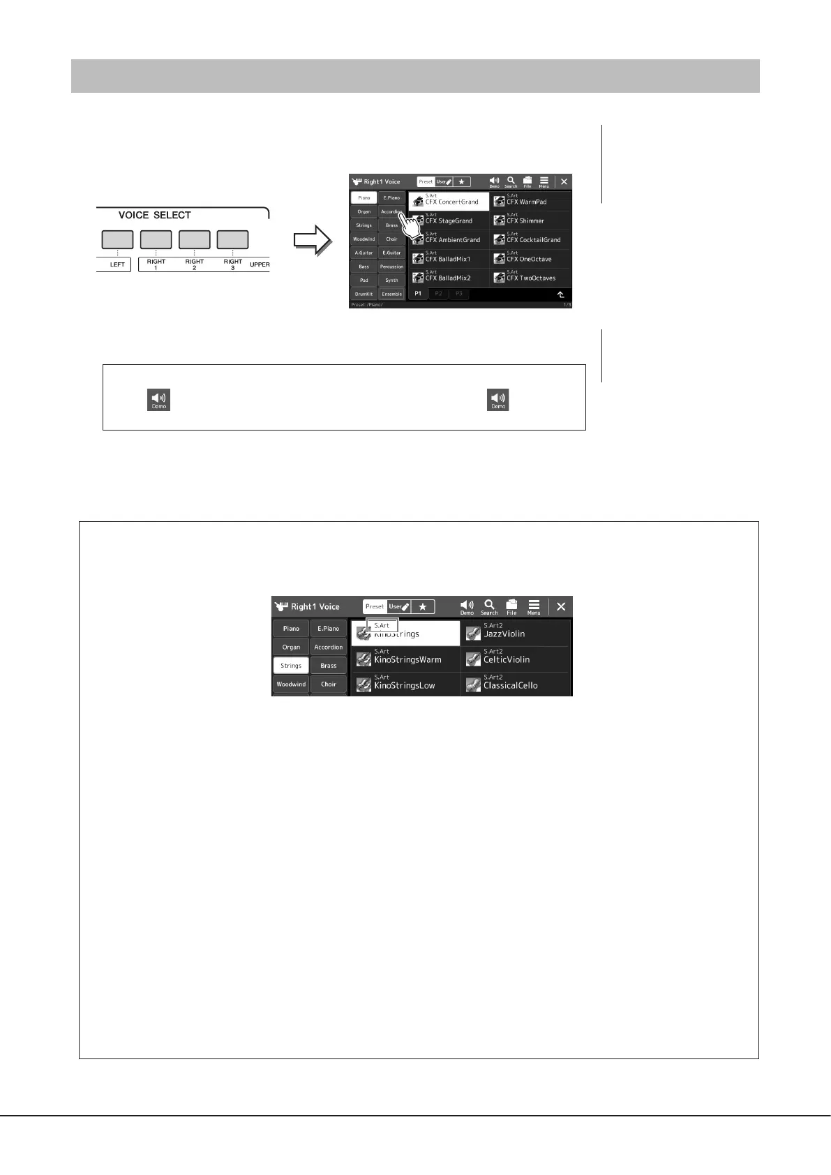 Touch (Demo) to start demo playback of the selected Voice. Touch (Demo)
