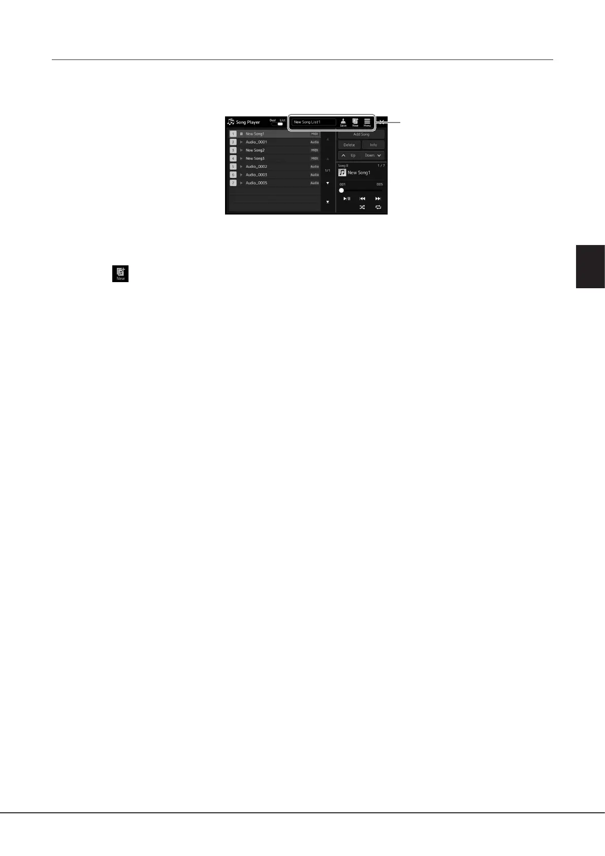 Touching (New) on the display allows you to create a new Song List.