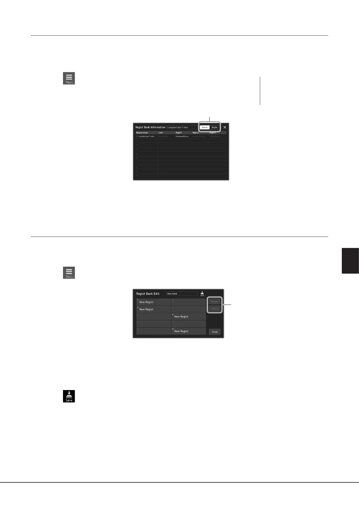 You can edit a Registration Memory Bank (delete or rename each Registration Memory, etc.) in the Regist Bank Edit display.