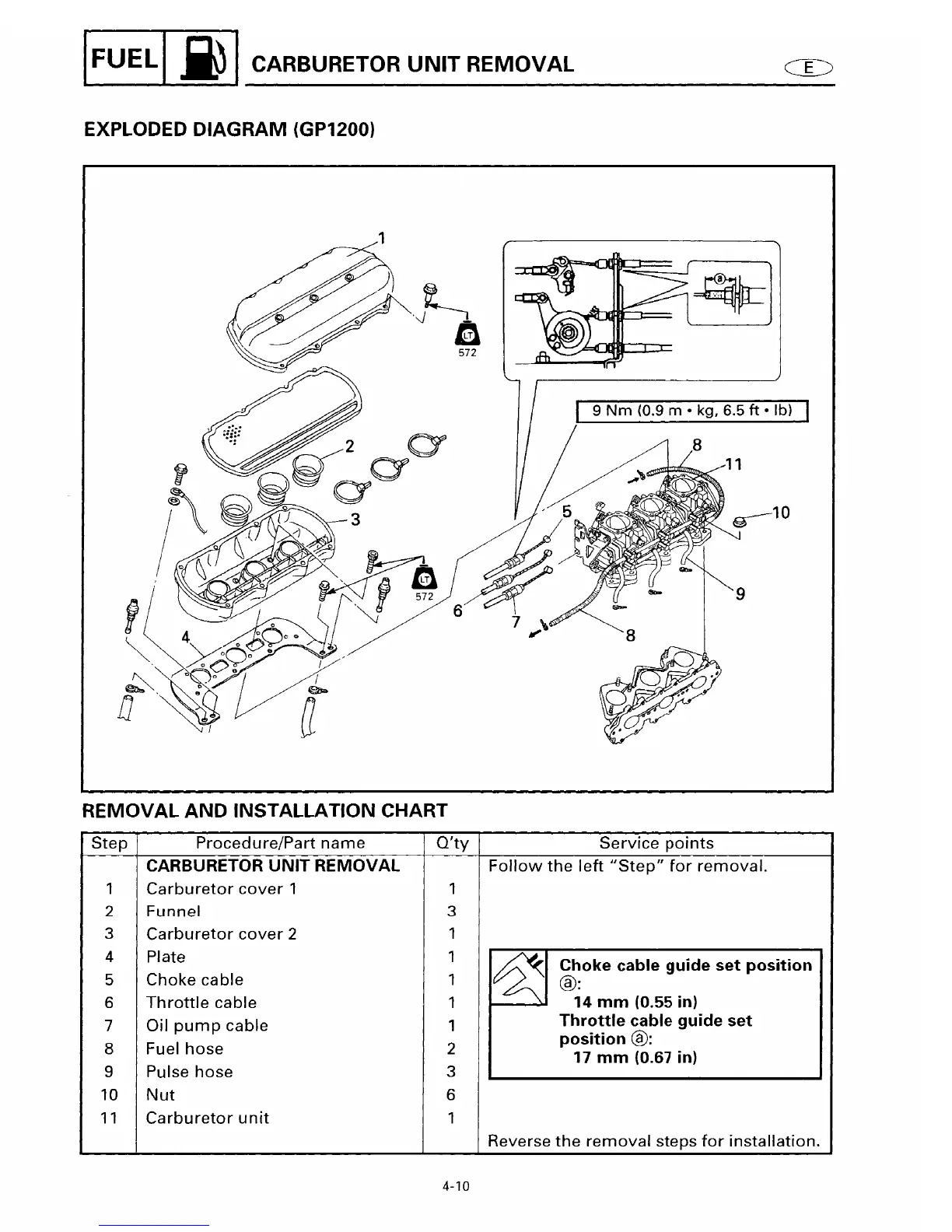 Yamaha GP760 - Carburetor Unit Removal Exploded Diagram (GP1200); Choke;Throttle Cable Guide Set Position