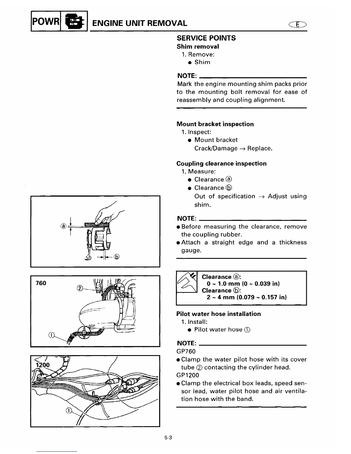 Yamaha GP760 - Shim Removal; Mount Bracket Inspection; Coupling Clearance Inspection; Pilot Water Hose Installation