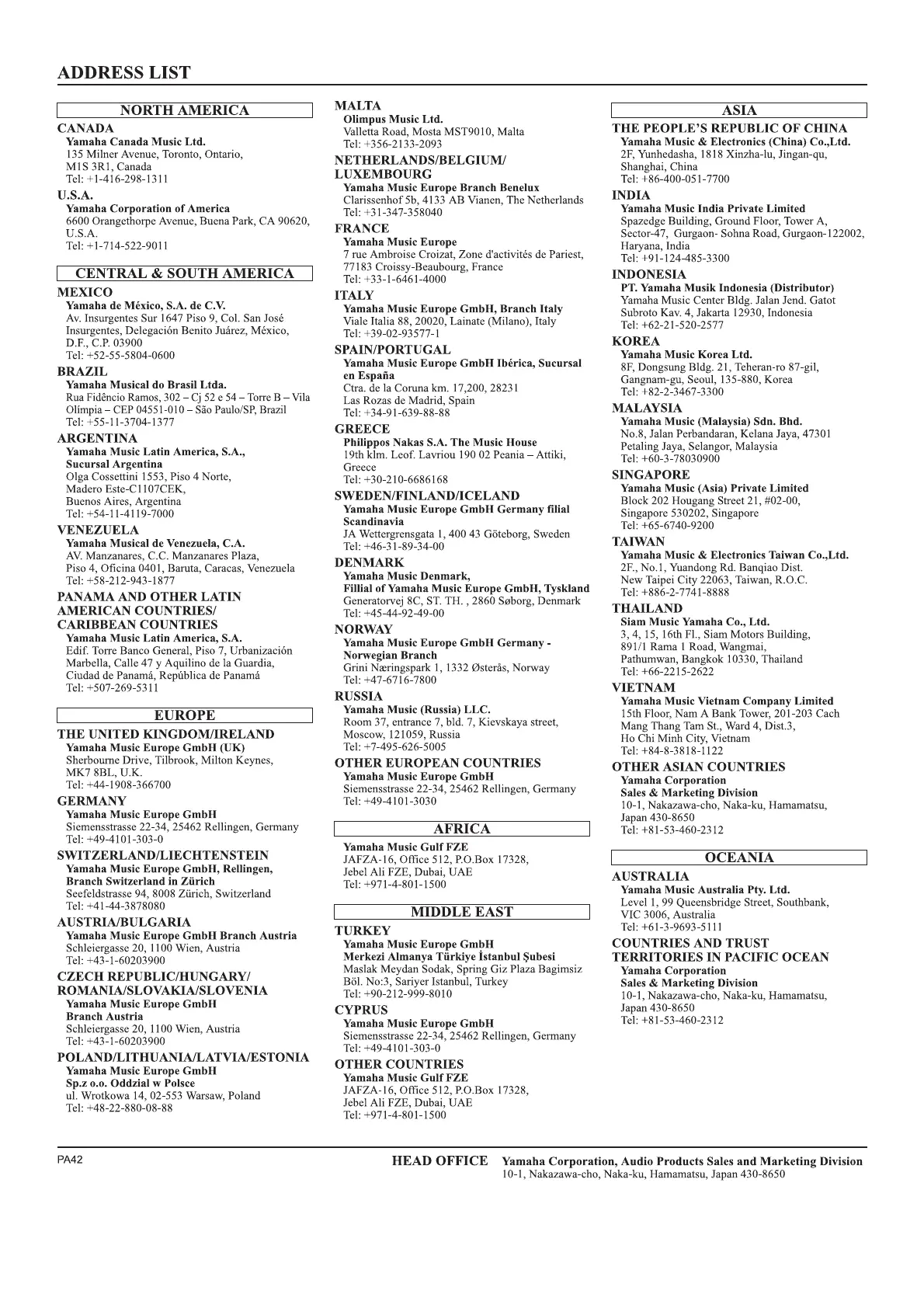 Yamaha HS8 - Yamaha Service and Support Locations; Global Address and Contact Directory