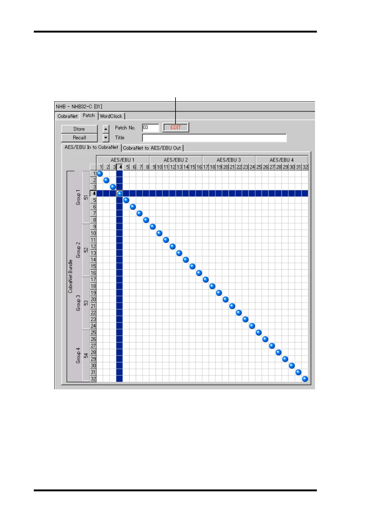 AES/EBU inputs and outputs are assigned to CobraNet channels on two 32 x 32 grids, one