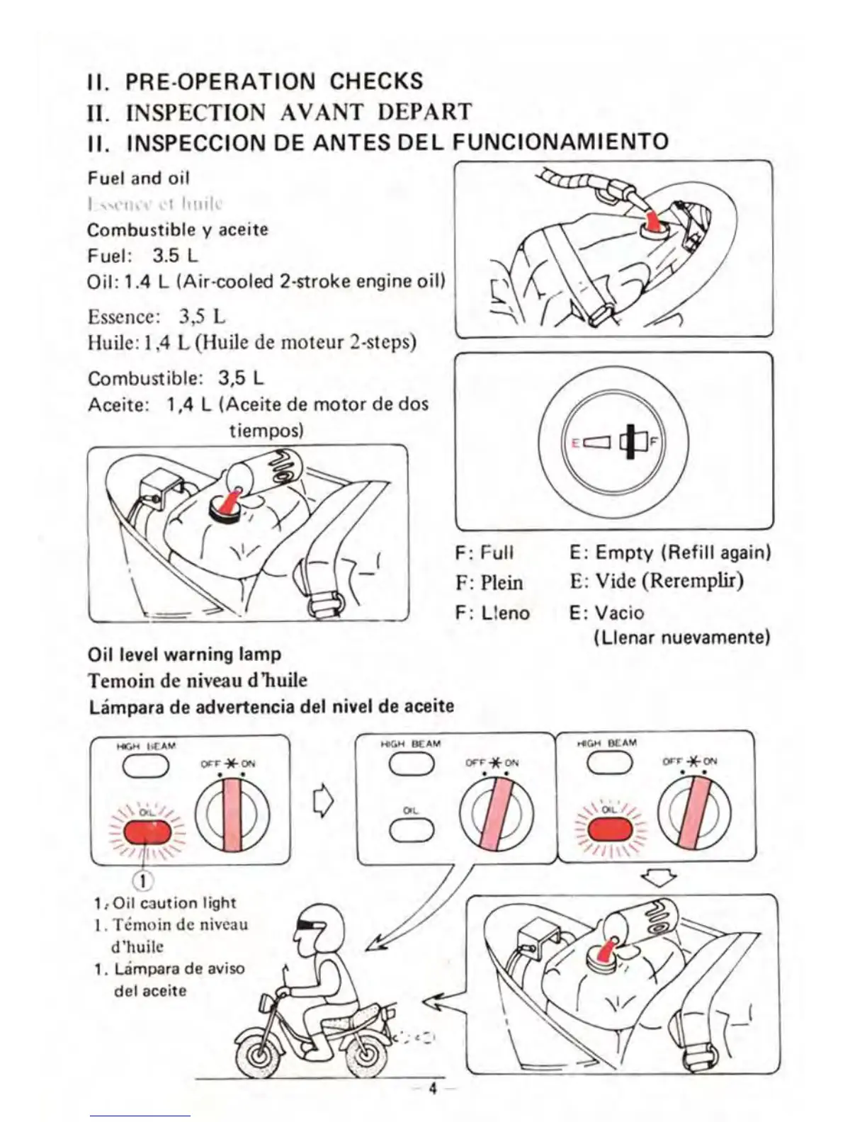 Yamaha LB50-2AE Chappy - Pre-Operation Checks; Fuel and Oil Levels; Oil Level Warning Lamp