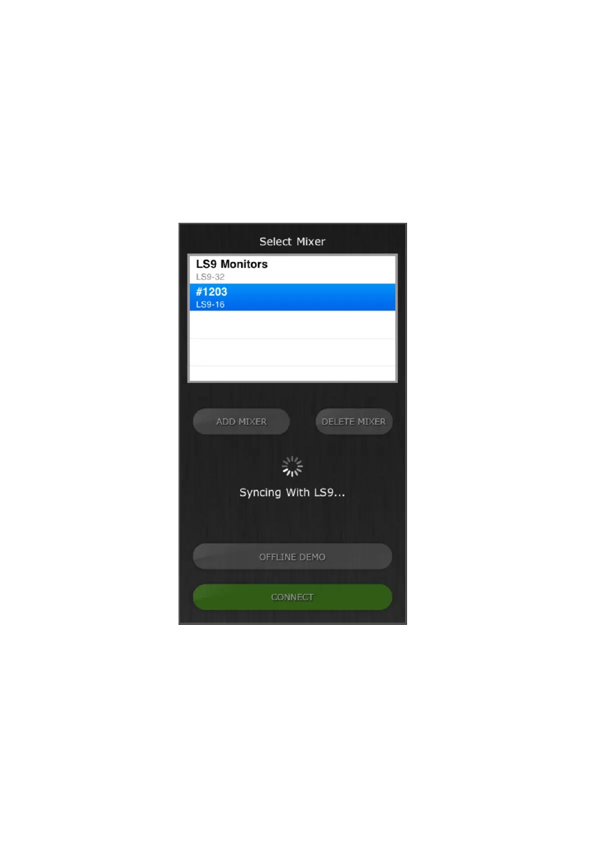 The message “Syncing With LS9…” will appear while StageMix is obtaining