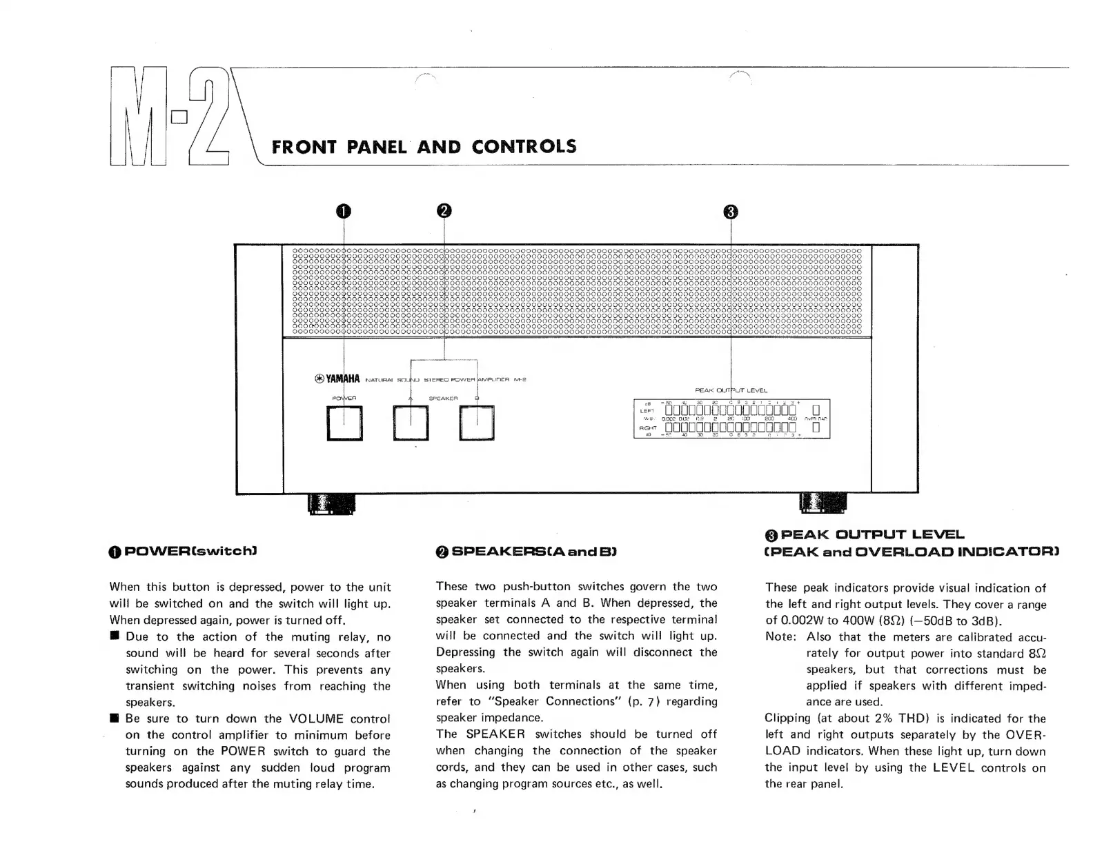 Yamaha M-2 - FRONT PANEL AND CONTROLS; POWER Switch; Speaker Selection (A and B); Peak Output Level Indicator
