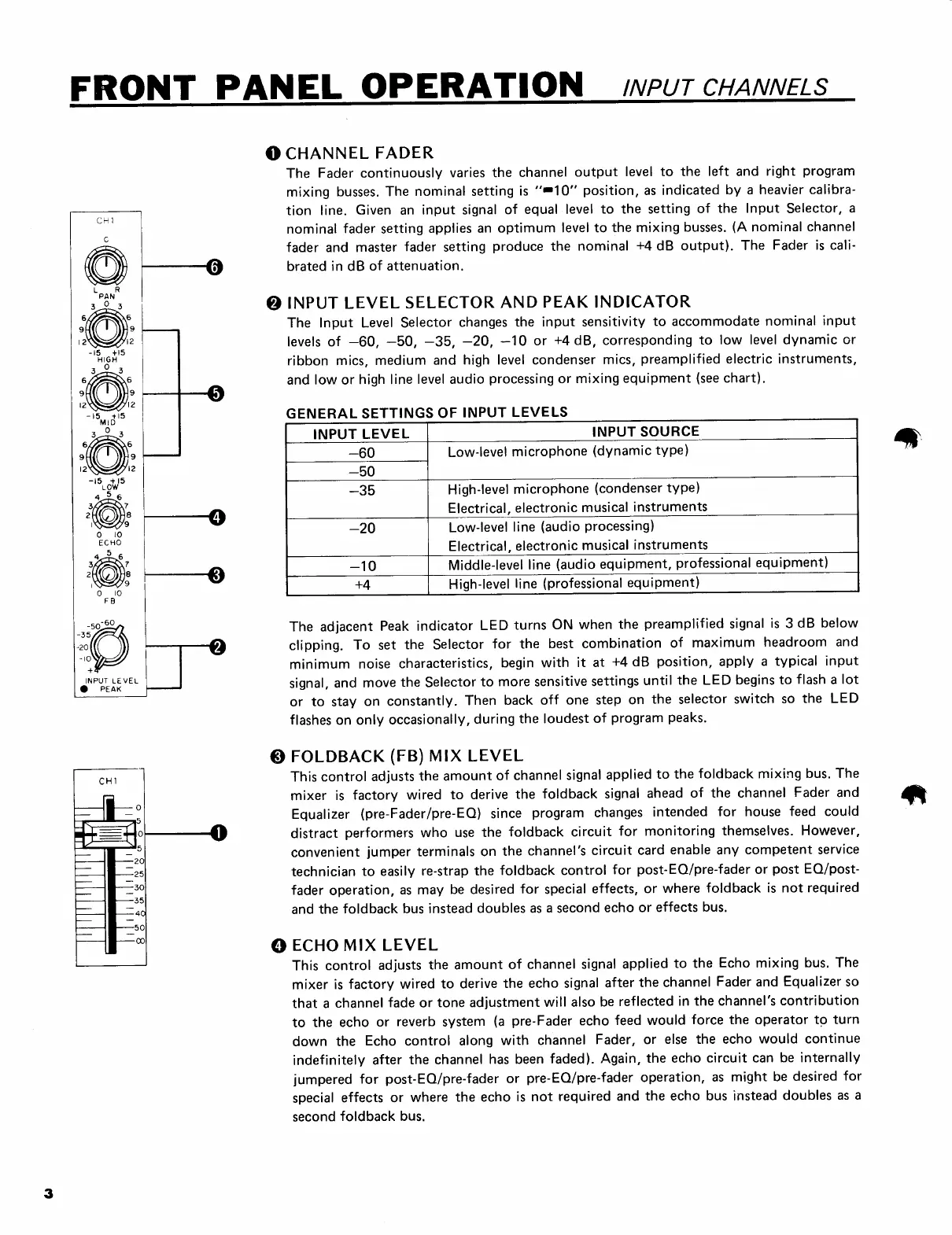Yamaha M508 - Front Panel Operation; Channel Fader; Input Level Selector and Peak Indicator; Foldback (FB) Mix Level