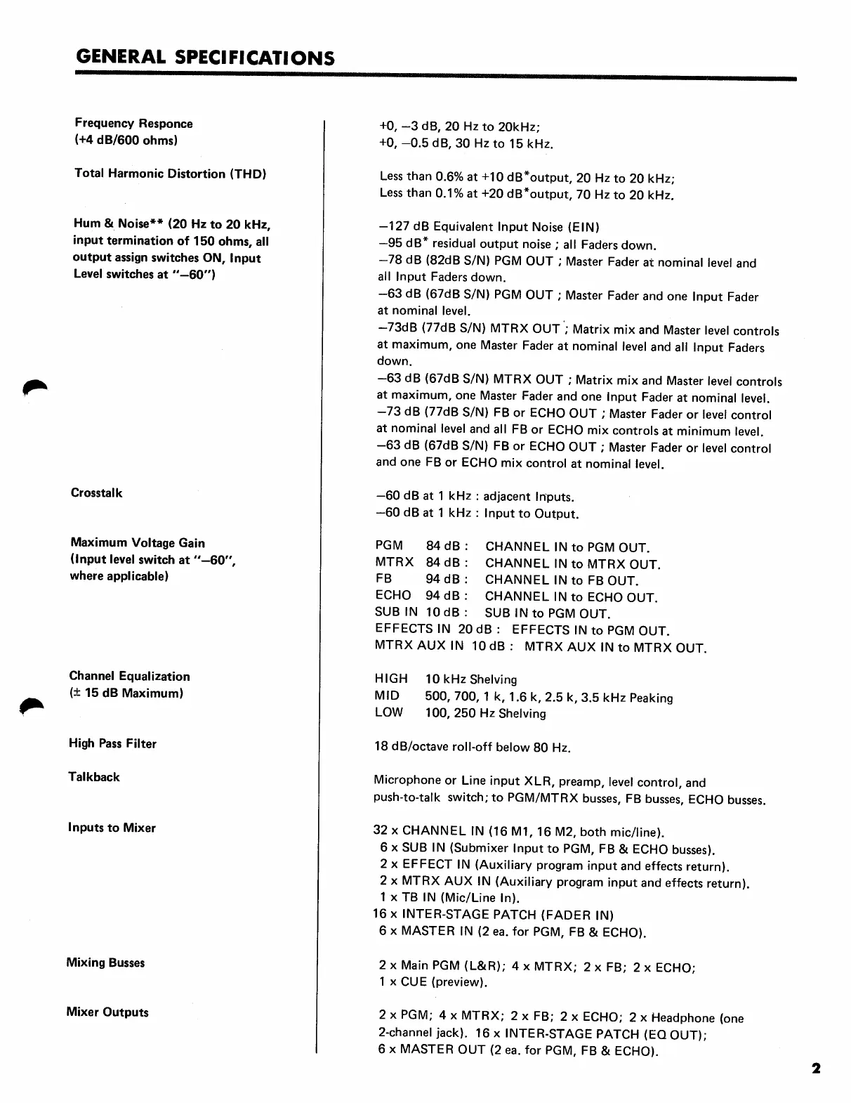Yamaha M916 - GENERAL SPECIFICATIONS; Frequency Response and Distortion; Hum, Noise, and Crosstalk; Voltage Gain and Equalization
