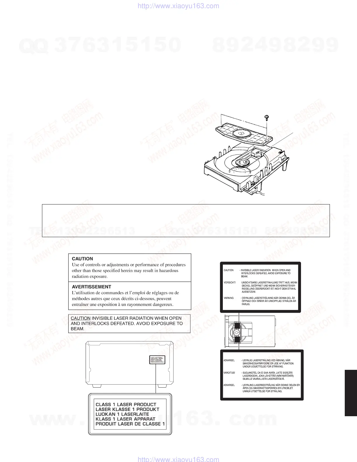 1) When the top cover is removed, and the STANDBY/ON SW is turned to the “ON” position, the laser component will emit