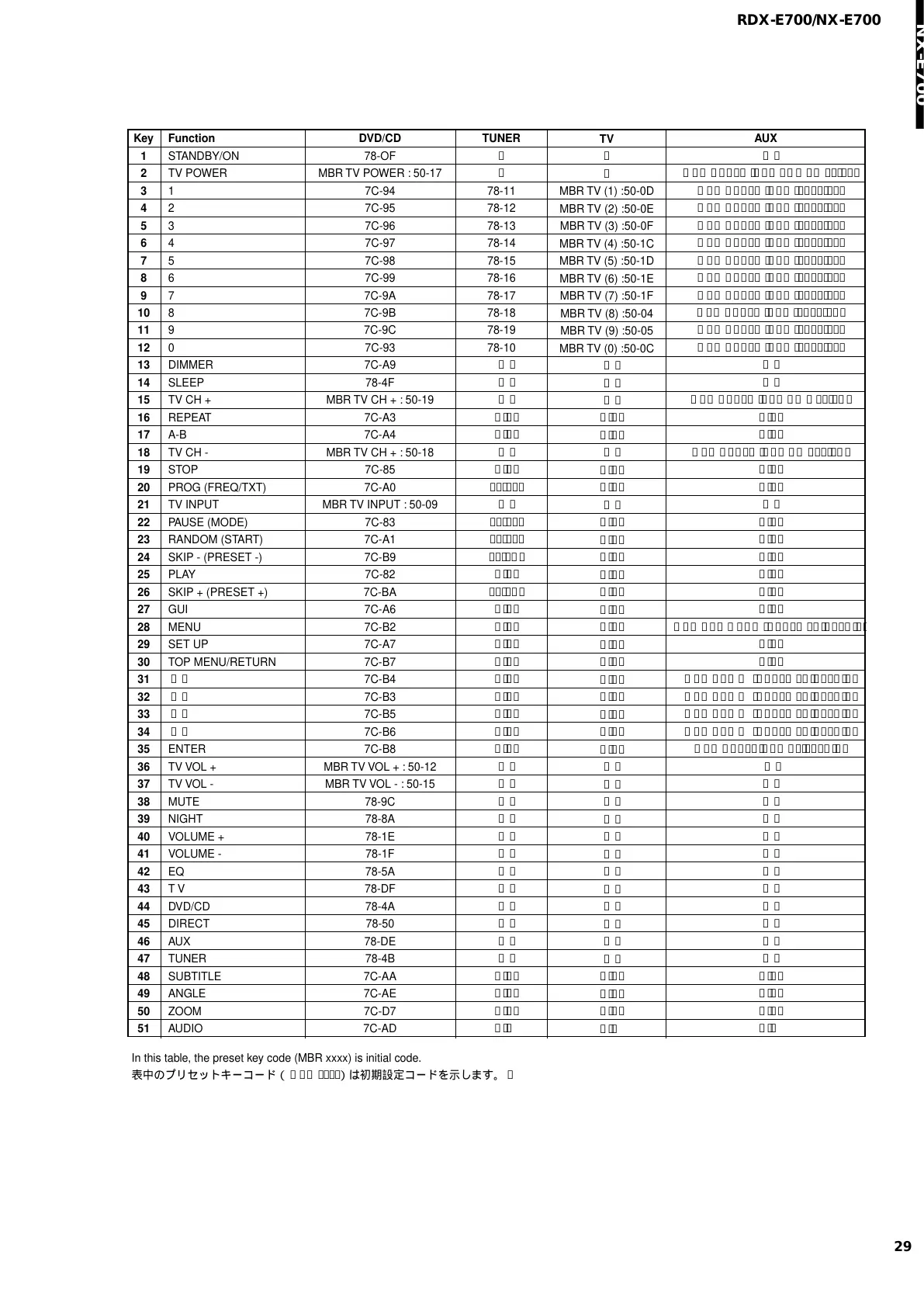 表中のプリセットキーコード(MBRxxxx)は初期設定コードを示します。