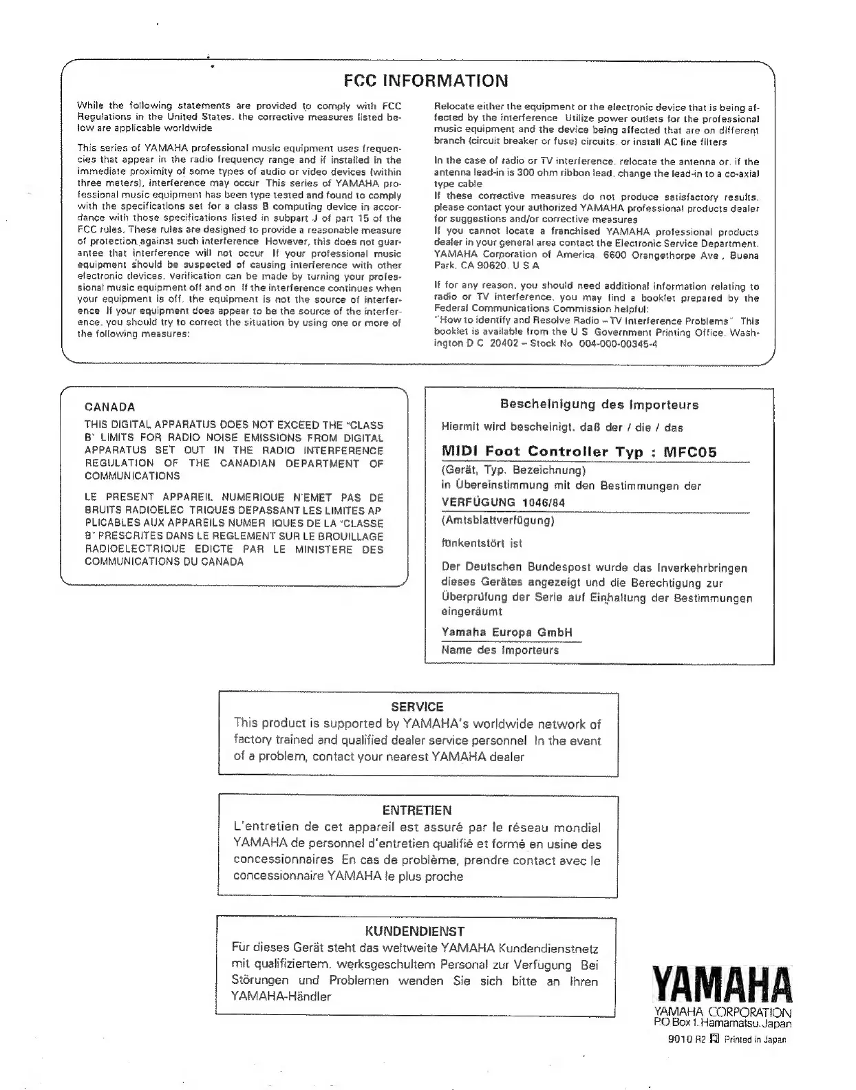Yamaha MFC05 - FCC Information; Compliance and Interference Measures; Service and Support; Product Support Information