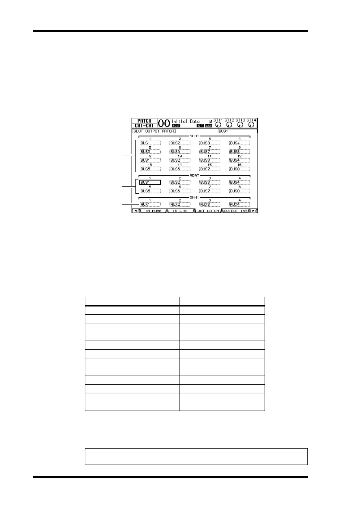 1 Press the DISPLAY ACCESS [PATCH] button repeatedly until the Patch | Out