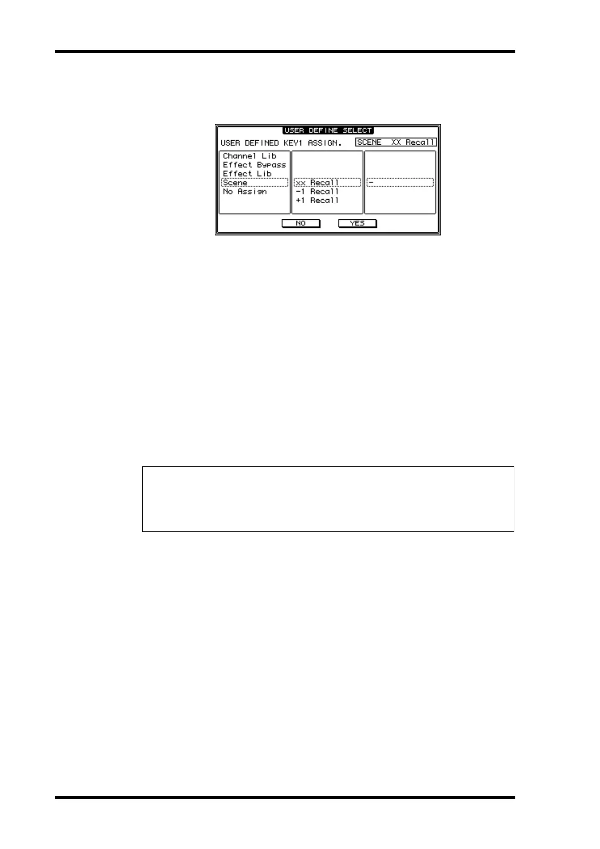 The 01V96 displays the User Define Select window, which enables you to assign functions