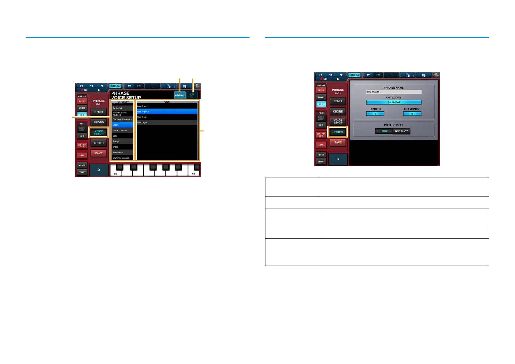 Area 1 is used to select the voice category; Area 2 the desired voice.