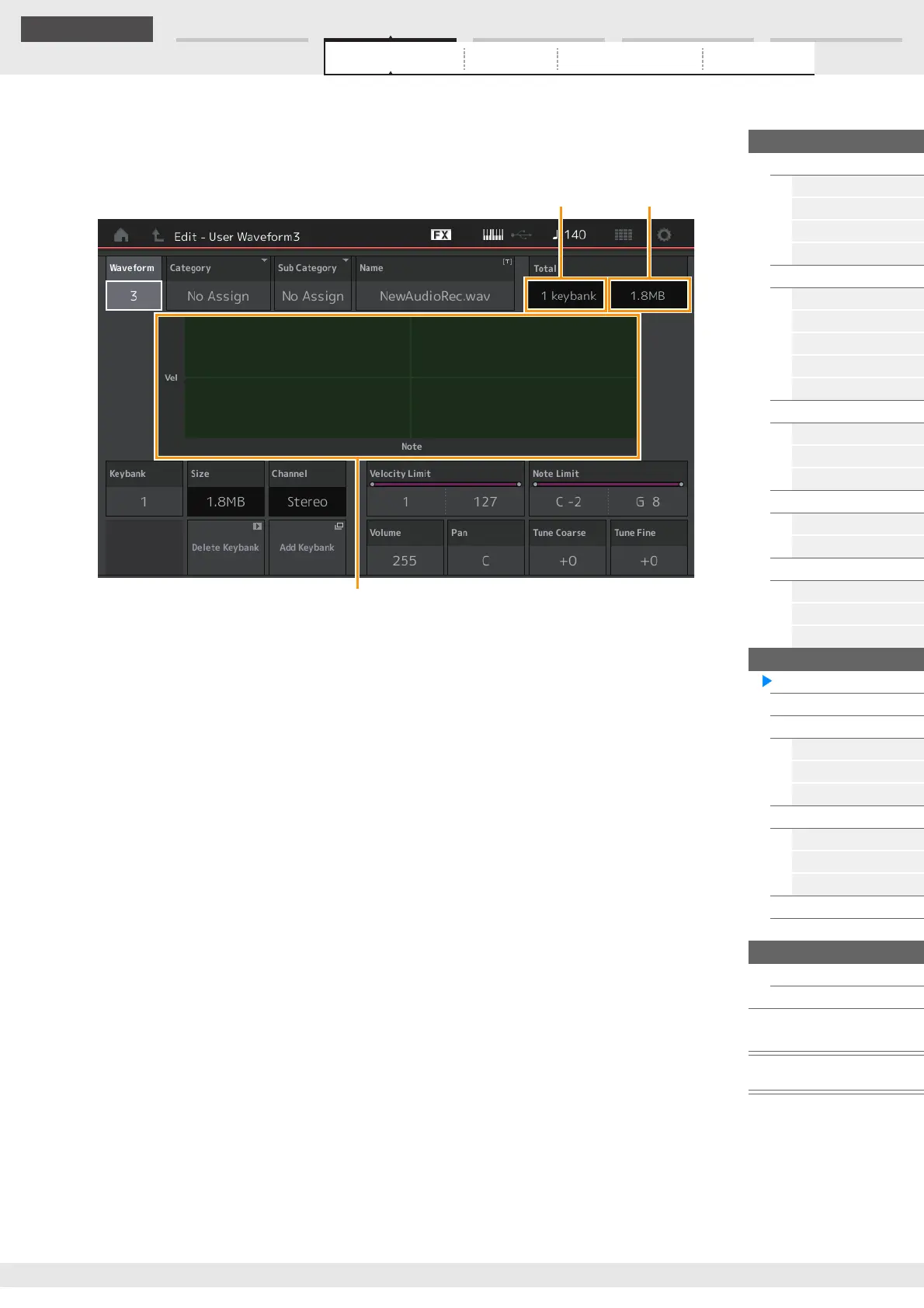 Indicates the Channel (Stereo or Mono) of the selected Key Bank.