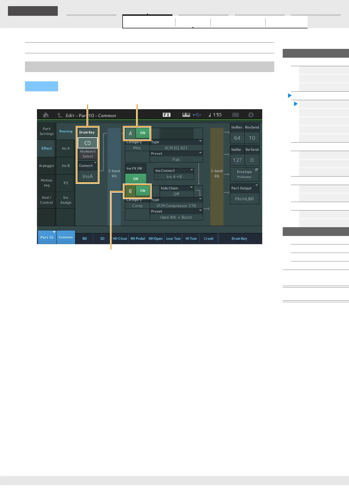 [PERFORMANCE (HOME)] [EDIT] Part selection Drum Key [Common] [Effect] [Routing]